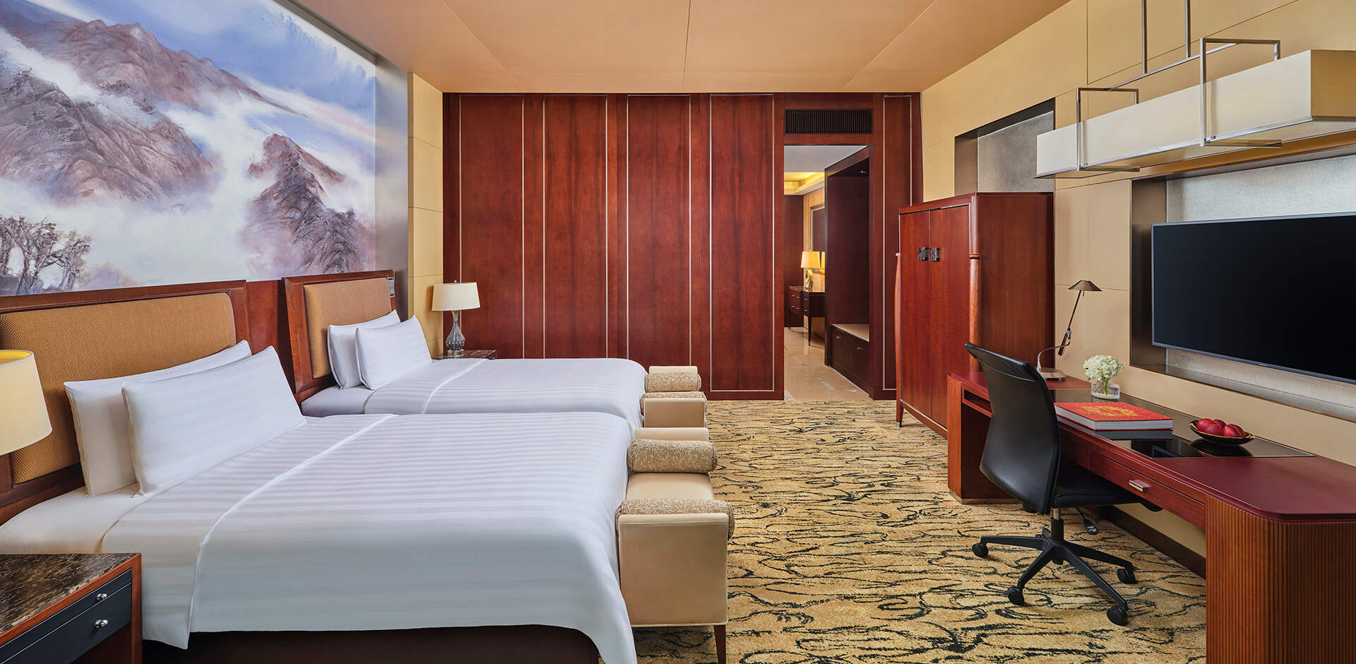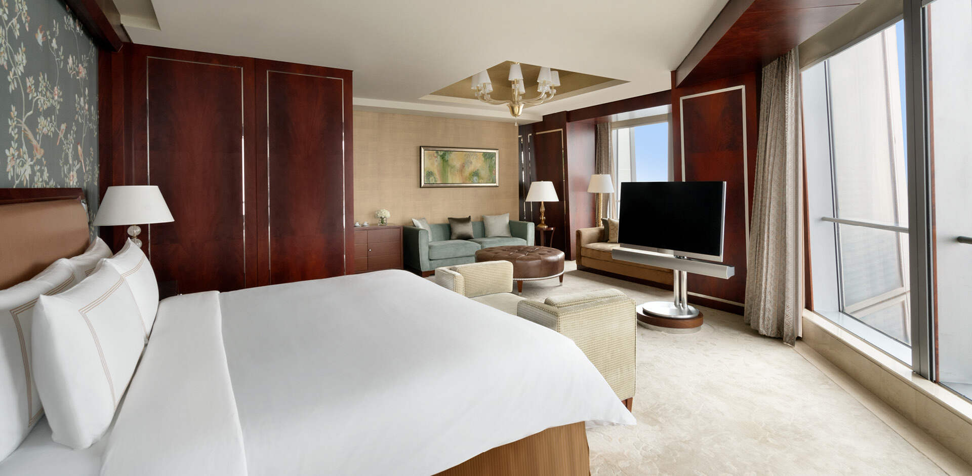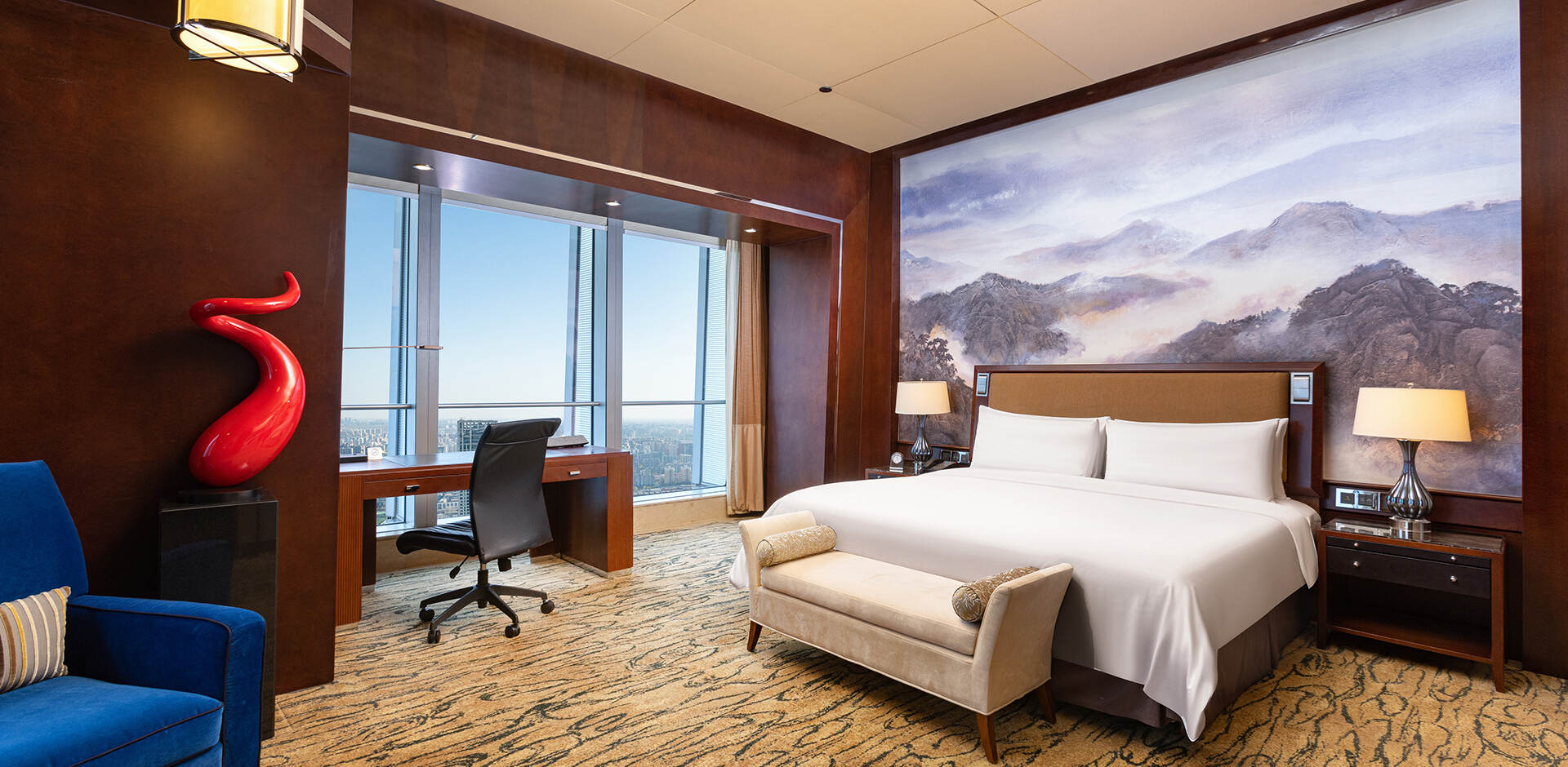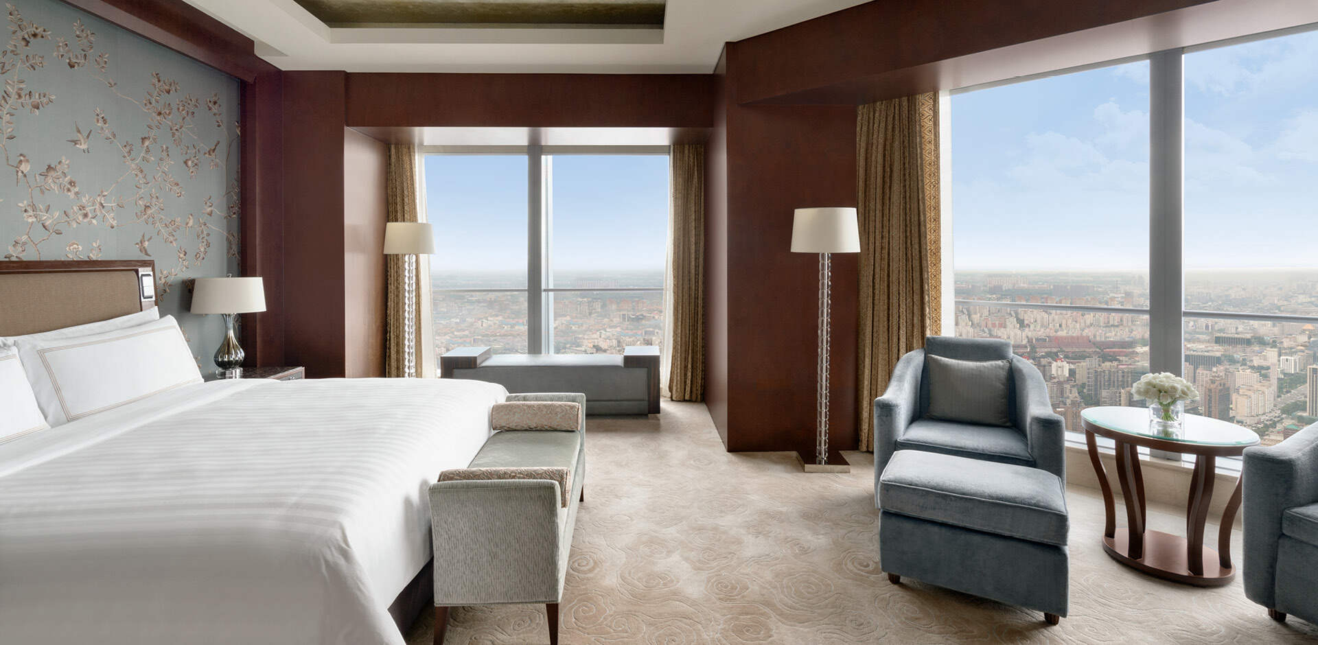 北京国贸大酒店客房位于64-77层,全部采用落地玻璃窗设计,让您放眼无边美景。贵宾堂位于北京国贸大酒店64层,可为住店客人提供全天24小时专属设施和贵宾服务,包括:咖啡、茶以及新鲜水果全天供应,美味小食每日三次更新;每间客房每日两小时使用贵宾堂内会议室。此外,宾客还可在酒店80层云·酷酒吧感受享憩时光,每日晚5时至7时,畅饮多款酒水饮品,观京城日落美景,品味惬意生活。