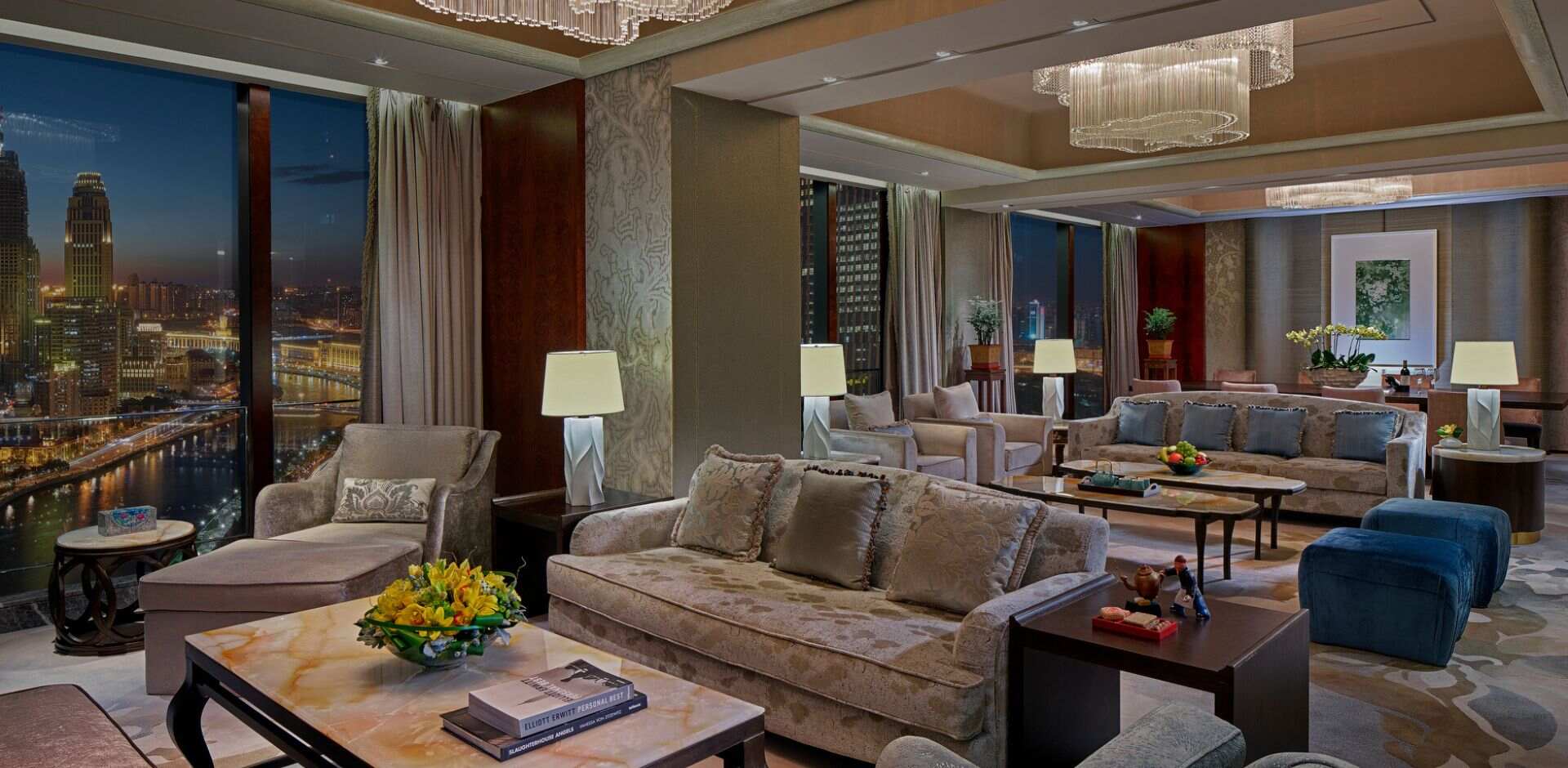 天津香格里拉304间客房,优雅舒适,视野开阔,玻璃幕墙把海河秀色与城市胜景呈现在客人眼前。客房以及服务公寓面积约在48平方米至240平方米之间,配备暖色调的实木装饰与精巧微妙的天津元素。柔蓝色地毯与海河的潋滟波光遥相呼应,偌大的迷你吧藏身在一个定制的中式柜子。客房配备多种设施,符合当今商旅客人的办公与休闲需要。